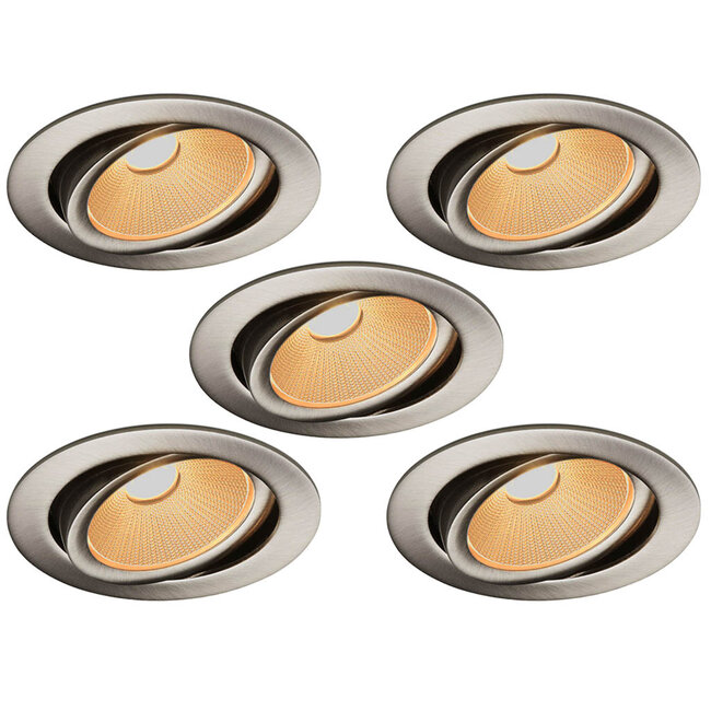 Set van 5 rvs kleur inbouw ledspot Oslo, 6 Watt, dim to warm wit IP44, kantelbaar, geschikt voor de badkamer. IP44. In een rvs kleur uitvoering.